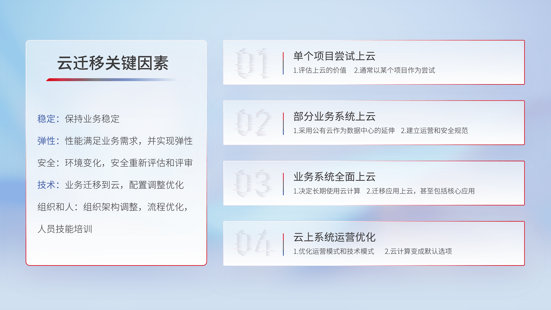 结合实际业务,,从规划设计、、云平台选型、、、云原生改造、、、数据迁移、、、、集成交付,,迁移全过程为客户识别最佳上云路径,,,做好风险识别管理,,,,设计网络架构、、、身份权限、、、、安全审计合规、、操作审计、、、、日志审计、、、、监控告警策略、、、多站点容灾设计等,,,对云上基础设施进行整体规划,,,,提升IT治理水平,,,以满足弹性、、高可用、、高性能的需求。。。。